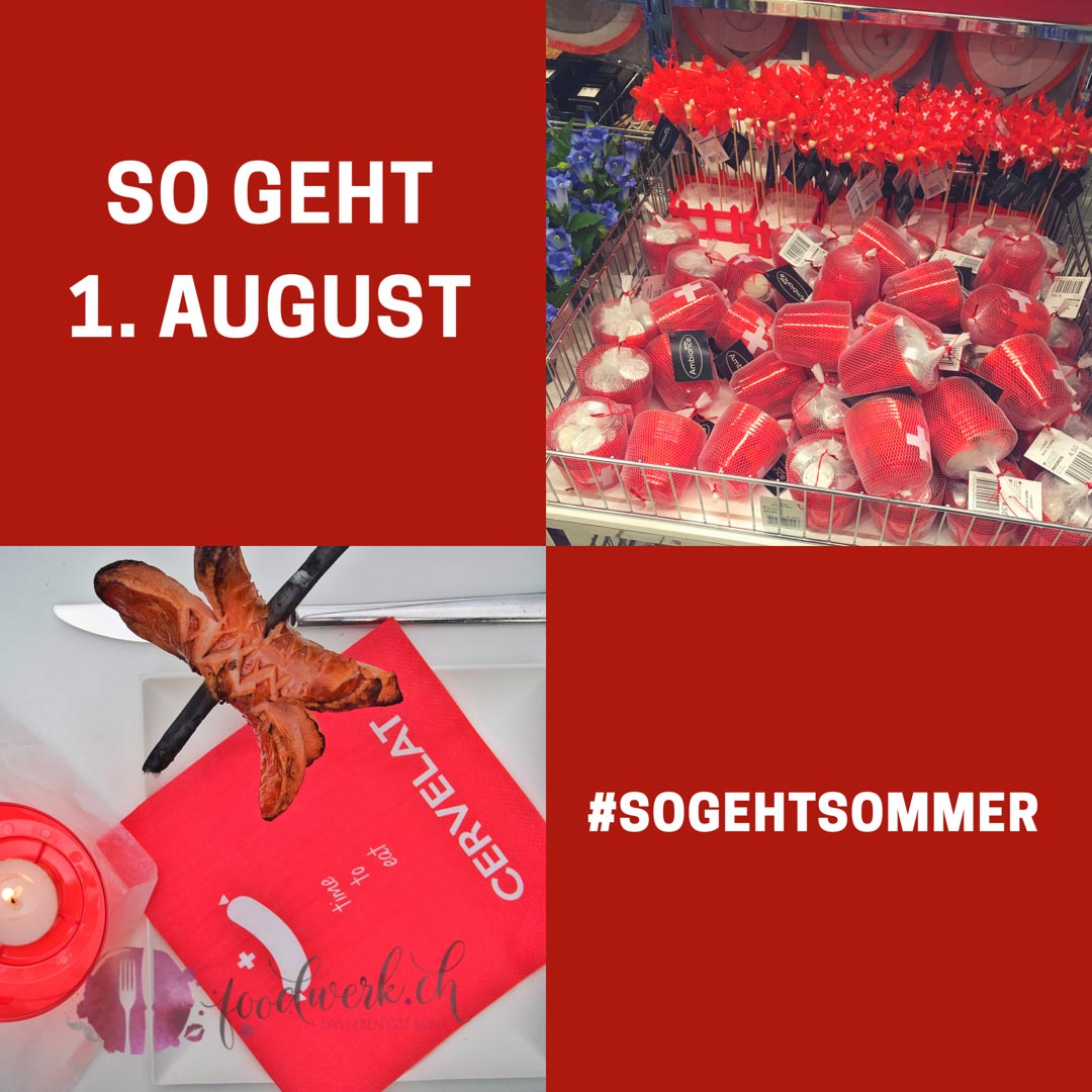 Der 1. August steht vor der Türe. Die Schweiz feiert seinen Nationalfeiertag. Etliche Familien packen ihren Rucksack und gehen wandern oder vergnügen sich an einem der vielen Bauernhof-Brunches. Generell wird der erste August im Freien verbracht, sofern das Wetter es zu lässt. Typischerweise wird morgens gebruncht und/oder abends grilliert. Dies ist normalerweise auch im Hause foodwerk.ch nicht anders. Dieses Jahr verweilen wir über dem 1. August in den Ferien und kommen erst kurz danach zurück. Daher haben wir nun schon mal ein wenig „vorgefeiert“, passende Deko dazu findet ihr bereits in den Läden. Fähnchen und die Teelichthalter gehören bei uns jedes Jahr dazu, dieses Jahr haben wir jedoch noch besonders Gefallen gefunden an den coolen Servietten mit dem Spruch: „time to eat Cervelat“. Dieser sowie die 1. August Wegge dürfen bei uns nämlich keinesfalls fehlen am