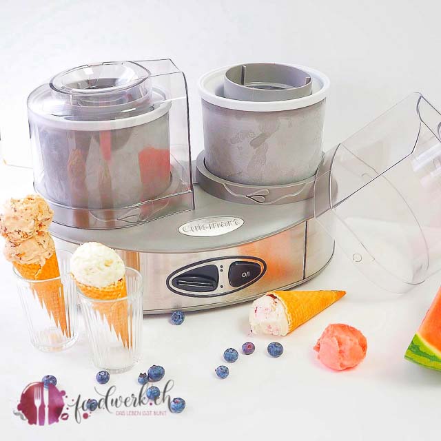 Wenn dass mal keine gute Erfindung ist! Eine Eismaschine mit der man zwei Sorten Eis auf einmal machen kann. Ausser bei unserem alt bewährtem Joghurteis gehen unsere Glacewünsche oftmals etwas auseinander. So wohl auch bei unseren Lesern. Wir haben euch nämlich in unsere Instastorie gefragt welche Eisrezepte wir für euch machen sollen und es sind wirklich einige tolle Vorschläge gekommen. Weil wir uns nicht Entscheiden konnten haben wir gleich vier davon rausgepickt. Heute also die Rezepte eines leckeren Raffaello Eises, gefolgt von dem leckeren aber nicht mastigen Snickers Eis, als Joghurtjunkie durfte ein extrem einfaches Joghurteis mit Blaubeerswirl nicht fehlen und zu last but not least ein sehr erfrischendes Wassermelonensorbet.