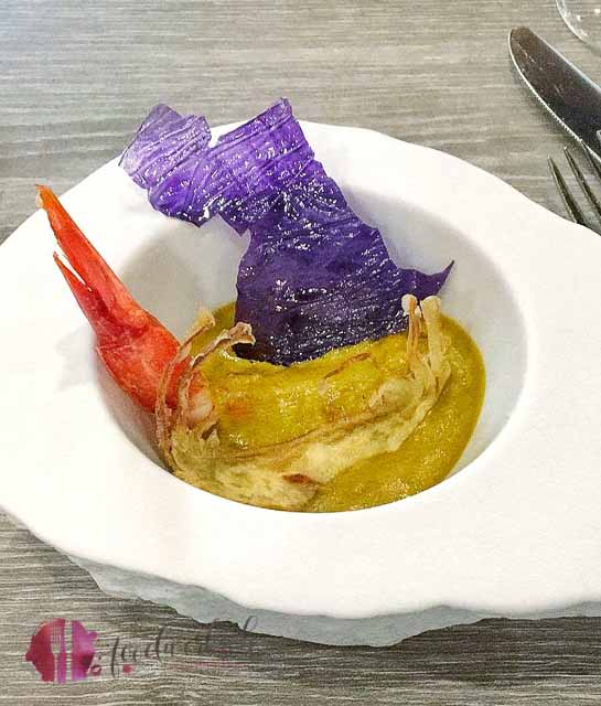 Der Kartoffelkristall beim nächsten Gang präsentierte sich knackig, salzig, schillernd und doch so zart. Begleitet von einer Muschelemulsion, Gamba Rioja und Artischocken. Nicht nur einen Augen-, sondern auch Gaumenfreude.