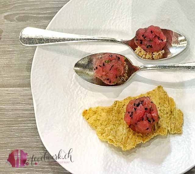 Weiter geht es mit Caprese Fucking Perfect. Der Name ist Program, so habt ihr Caprese wirklich noch nie erlebt! Versprochen! Zuviel möchten wir nicht verraten, es war einfach definitiv FUCKING PERFECT! Weiter geht die kulinarische Reise mit Rosa Thunfisch, Limetten, Kokosnuss und Quinoa. Eher puristisch angerichtet und doch eine neue Erfahrung.