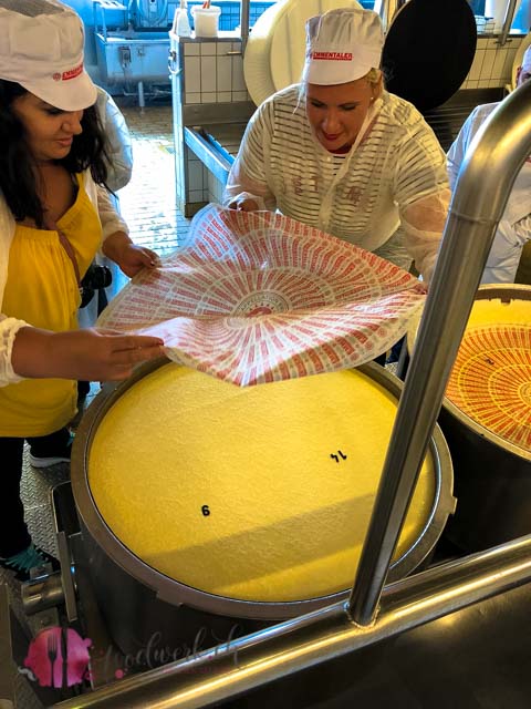 den wir mit Zug und Bus zurückgelegt haben, fuhren wir durch grüne, ländliche Landschaften. Wir freuten uns riesig was da wohl auf uns zukommen mag. Bei der Schaukäserei in Affoltern im Emmental sind wir auf die anderen Blogger gestossen. Nach einer herzlichen Begrüssung ging es dann auch schon gleich los. Wir durften im alten Stöckli so einiges übers Käsen erfahren und durften sogar selbst Hand anlegen. Tobi sah schon fast aus wie ein echter Käsermeister (siehe Video) . Dieser Käse muss nun noch etwas lagern und schon bald bekommen wir unseren eigenen Käse zugesendet. Darauf sind wir schon ganz gespannt. Auch durfte ich (Caro) mit Hilfe von der lieben Nancy von Cookie Secrets eines der grossen Laibe mit Käseetiketten aufkleben. Gar nicht so einfach. Die Etiketten sind alle mit einer Nummer versehen, so dass man bei Kauf des Käses schauen kann wo dieser produziert wurde.
