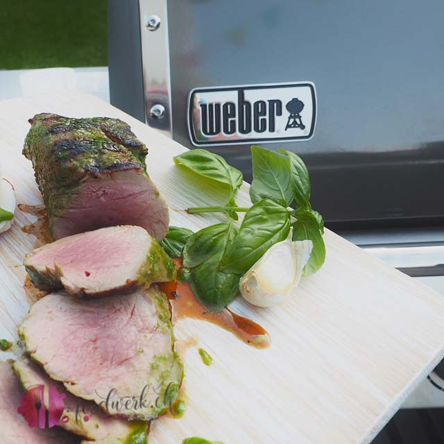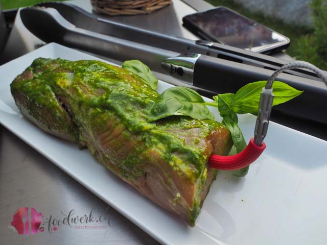 Definitiv eines unserer liebsten Kräuter in der Küche ist der Basilikum. Sommerlich duftend wird er in rauen Mengen im Hause foodwerk.ch verspiesen. Und da wir, wie einige von euch bereits wissen einen neuen Weber Grill Genesis II haben, dieser Sommer sich ausserordentlich schön präsentiert und Liv im Pfadfinderlager ist, nützen wir die Zeit um neue Rezepte herauszutüfteln. Dieses mal sollte es eine Grillmarinade sein mit viiiiel Basilikum. Und da Tobi sein neues Grillthermometer, den I Grill 3 gerne ausprobieren wollte habe ich uns kurzerhand ein Stück Schweinefilet besorgt, aus welchem wir dieses leckere Grillfilet mit Basilikum Marinade hergestellt haben. Da wir keine Gäste hatten und auch Liv ausser Hause ist, haben wir nicht das ganze Filet gegrillt. Wäre doch ein wenig viel für uns Zwei gewesen.