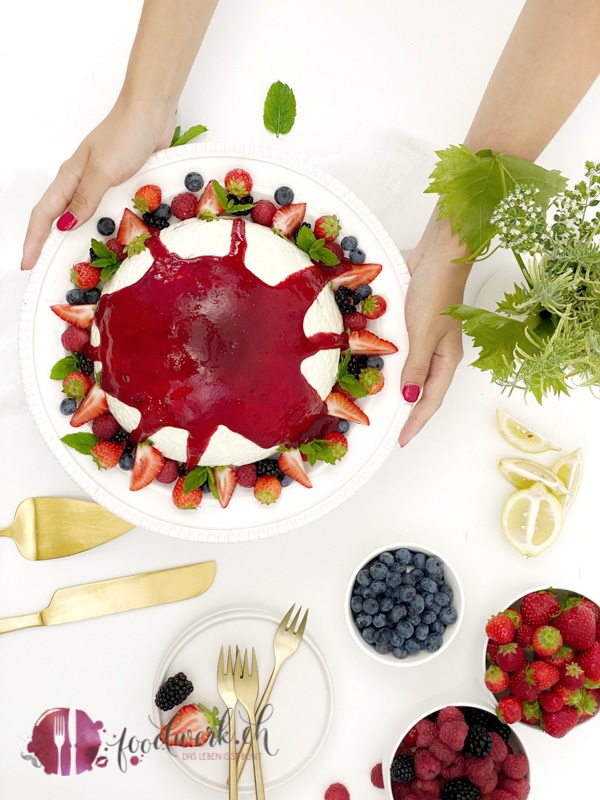 - Die Torte stürzen und von der Frischhaltefolie befreien. Mit Beeren ausdekorieren und servieren, denn das Leben is(s)t bunt!