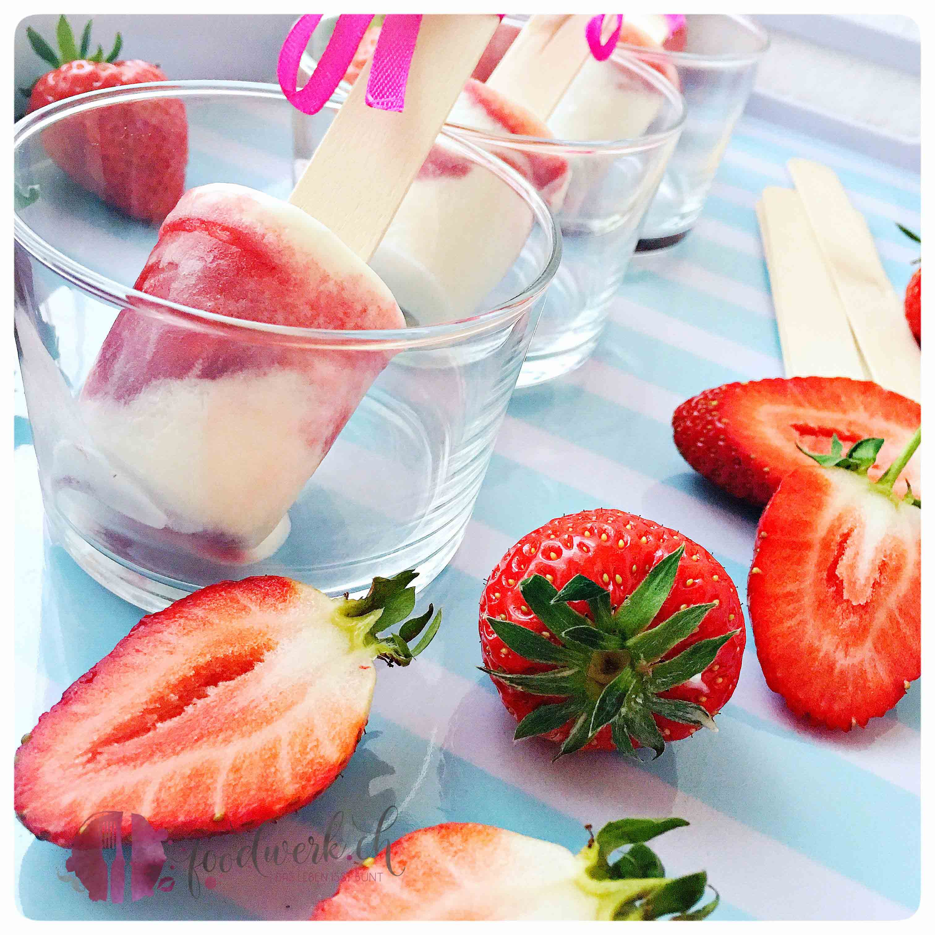 Die Buttermilch in eine Schüssel geben. Den Zucker, Vanillezucker und die Spritzer Zitronensaft ebenfalls in die Schüssel geben. Nun so lange rühren, bis sich der Zucker aufgelöst hat. Die Sahne steif schlagen hinzugeben uns nochmals gut durchrühren. Die gesamte Mischung für ca. 30-45 Minuten im Tiefkühler anfrieren lassen. In der Zwischenzeit die Erdbeeren mit dem Zucker pürieren und ebenfalls etwas anfrieren lassen. Die gut gekühlte Eismasse abwechslungsweise mit der Erbeersauce in die vorbereiteten Becher geben und nochmals für ca. 30 Minuten in den Tiefkühler geben. Die Eisstängel in die Masse drücken und das Ganze für mindestens 4 Stunden frieren lassen.