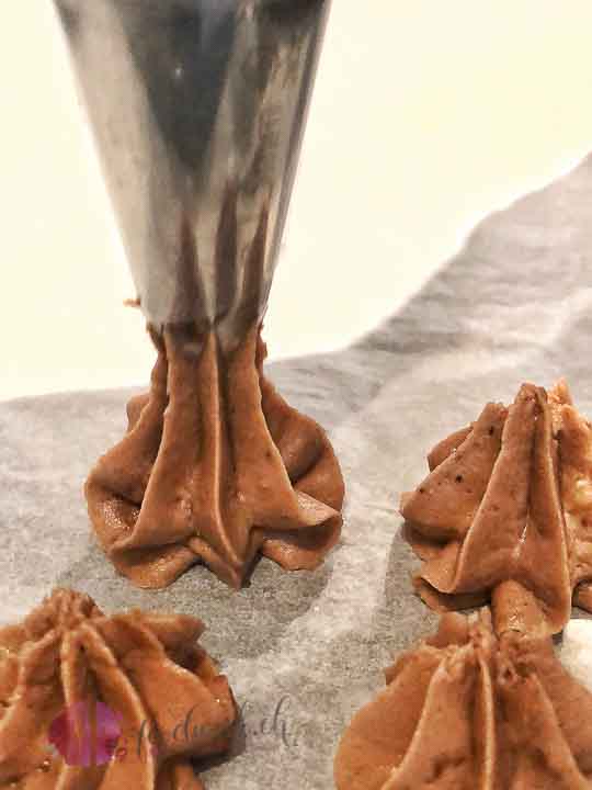 - Am besten in einen Spritzbeutel abfüllen und Rosetten auf ein mit Backpapier belegtes Backblech dressieren.