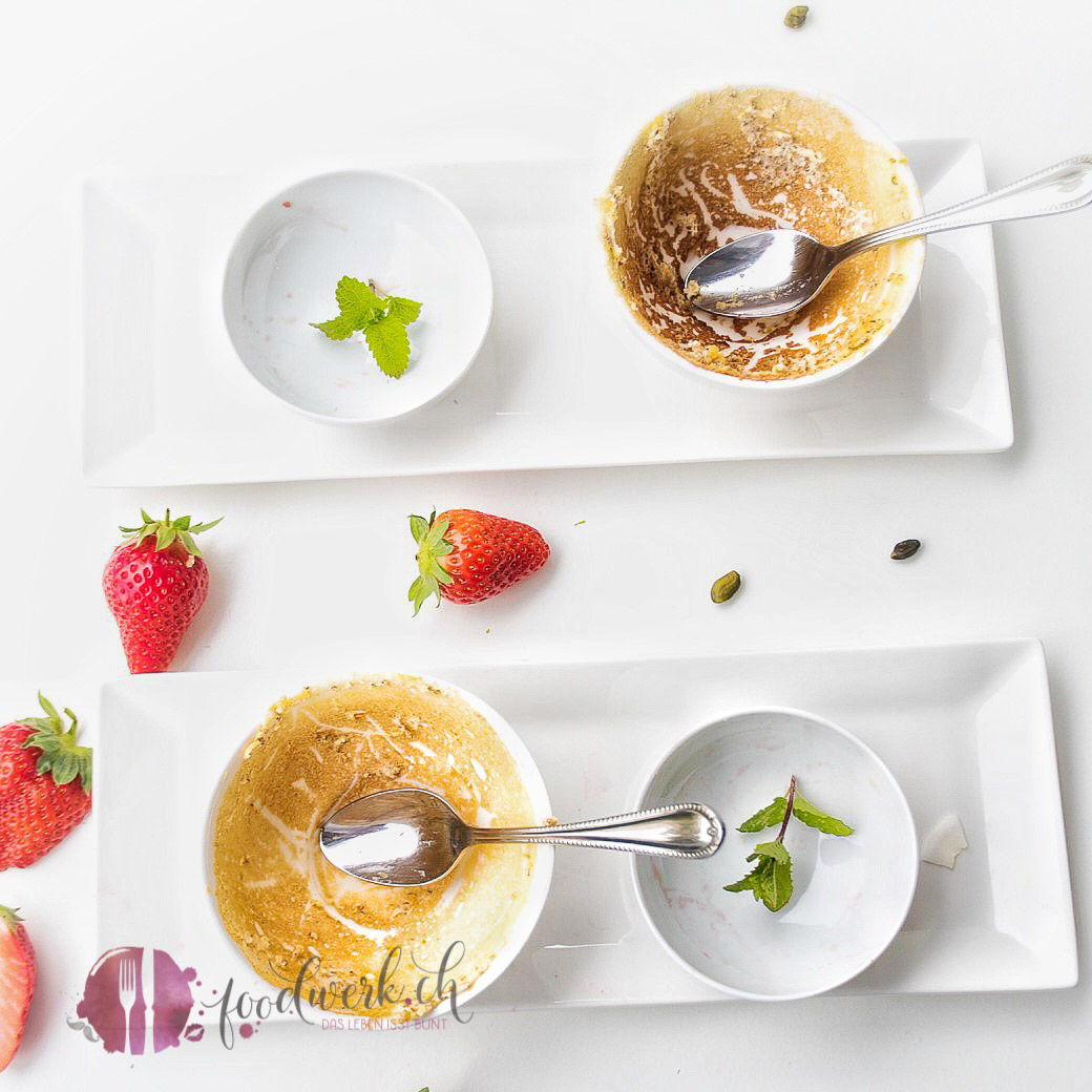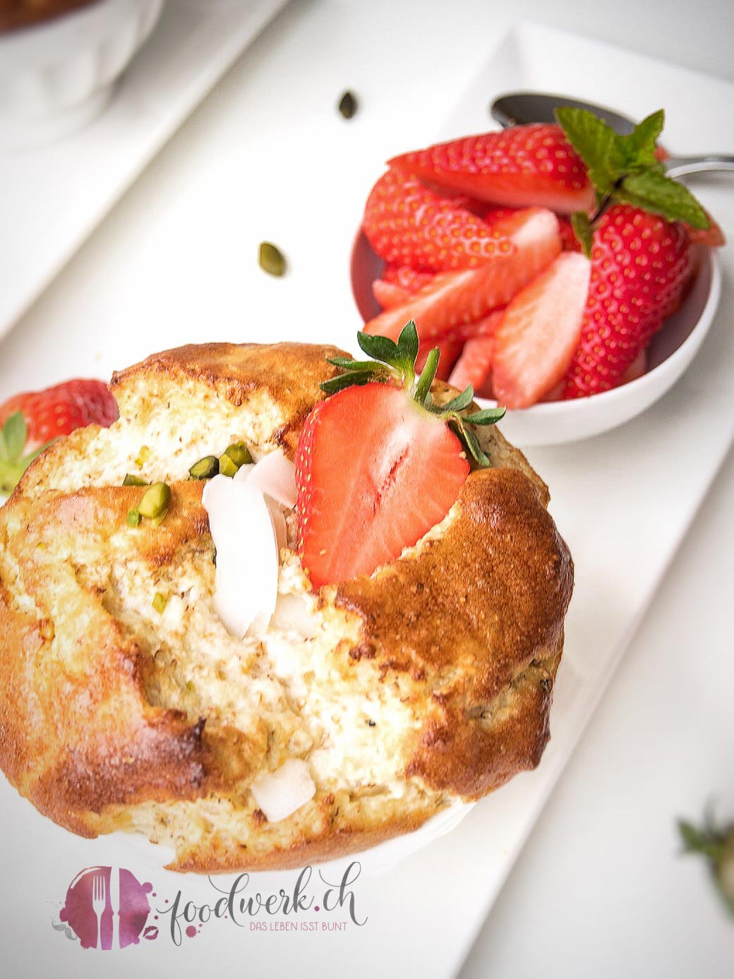 Wir haben dazu frische Erdbeeren serviert und mit etwas gehackter Pistazie und Kokosnusschips dekoriert. Ihr könnt natürlich auch frische Früchte nach eurer Wahl verwenden. Falls ihr den Auflauf noch etwas aromatisieren wollt, könnt ihr noch einen Esslöffel Kokosflocken hinzu geben. Wir mögen ihn nature mit etwas Vanille am liebsten, denn das Leben isst bunt!