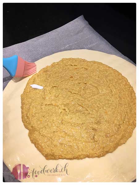 Die Galette bei 180°C im vorgeheizten Backofen während ca. 20 Minuten backen. Dann die Temperatur auf 150°C reduzieren und weitere 10 Minuten backen.