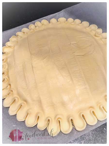 Die weiche Butter mit den gemahlen Mandeln und dem Amaretto vermischen und unter die erkaltete Creme mischen. Die Füllung auf den ersten runden Blätterteig geben und verteilen. Wichtig dabei ist, dass ihr einen ca. 3 cm Rand dabei frei lässt. Nun den „König“ platzieren und den Rand mit Eiweiss bestreichen. Mit dem zweiten runden Blätterteig zudecken. Die Ränder etwas festdrücken und mit Hilfe von zwei Fingern und eines Messerrückens das Muster in den Rand drücken (siehe Bildstrecke). Das Eigelb mit der Sahne vermischen und den Kuchen damit bestreichen. Nun das Eigelb kurz antrocknen lassen und mit Hilfe eines Holzspiesses von der Mitte her feine Linien einzeichnen.