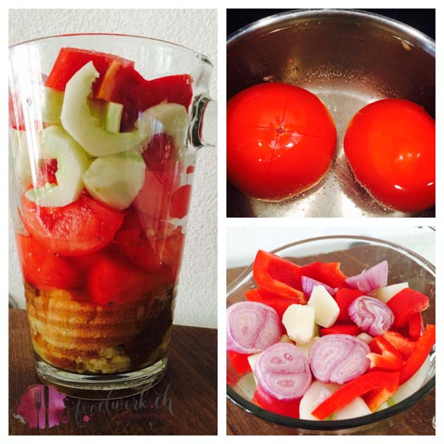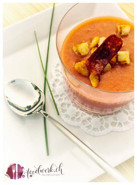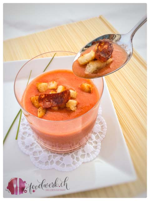 Das Brot vom Vortag in Stücke schneiden und im Backofen oder in der Pfanne etwas rösten. Die Gurken entkernen und in grobe Stücke zerteilen, die geschälten Tomaten in viertel schneiden. Die Peperoni und die Schalotten in Stücke schneiden und mit den anderen Zutaten in einen Mixbecher oder Massbecher mit dem Mixstab alles fein pürieren, mit Salz und Pfeffer abschmecken und mit dem Chiliöl für die nötige schärfe in der Suppe sorgen. Anschliessend für mindestens 2-3 Stunden kühl stellen. Mit Brotcroutons und einer gerösteten Scheibe einer Chorizo garnieren. In einem Glas wirkt die Gazpacho richtig toll, denn das Leben isst bunt!