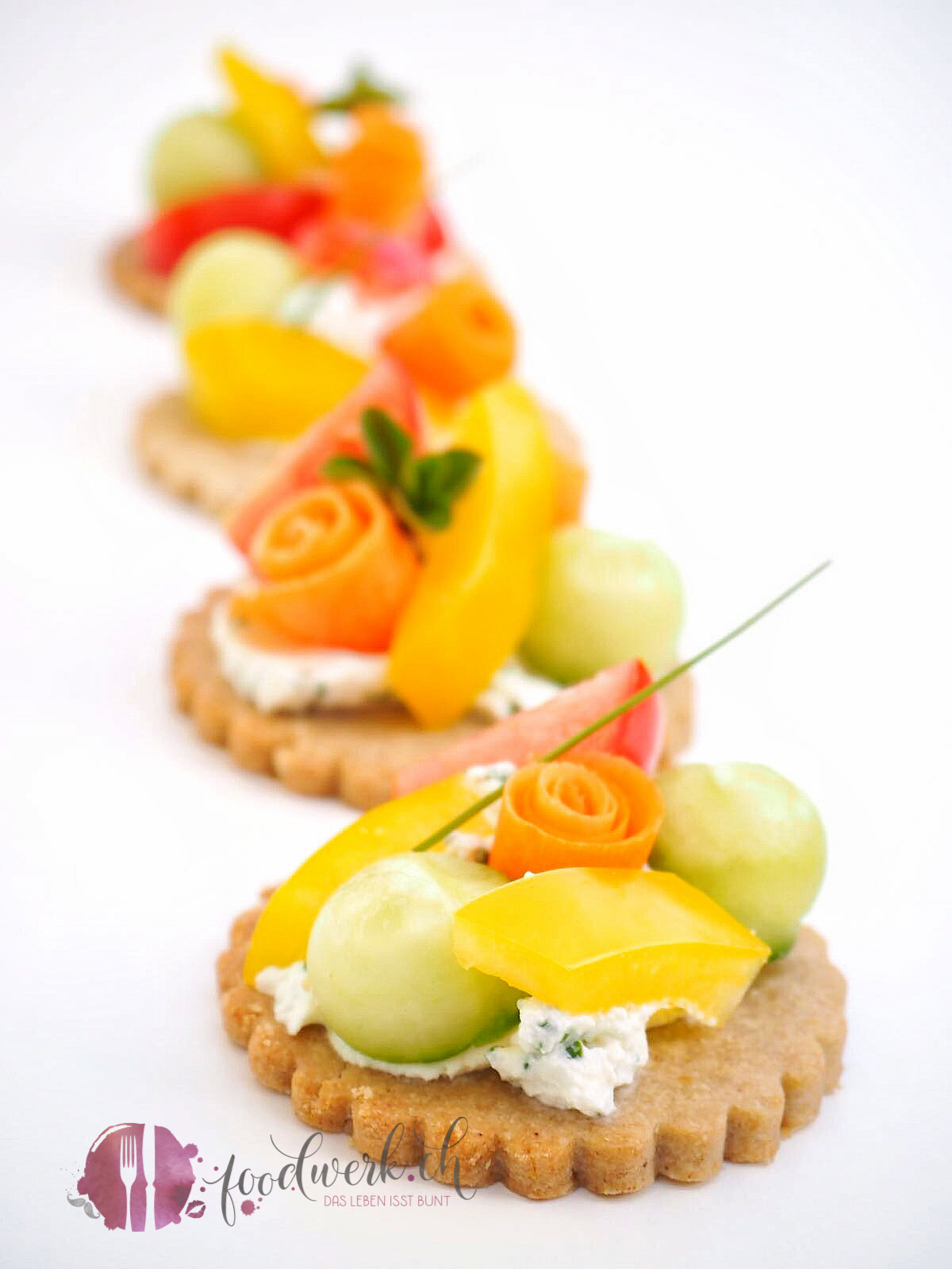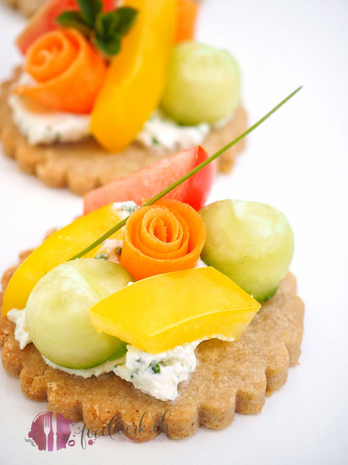 Die Kräuter eurer Wahl fein hacken und unter den Frischkäse mischen. Mit etwas Kräutermeersalz abschmecken. Den Kräuterfrischkäse auf die Taler geben und mit dem klein geschnittenen Gemüse belegen. Aus der Gurke haben wir kleine Kugeln gemacht. Die Karotten haben wir mit dem Sparschäler in dünne Streifen geschnitten und zu kleinen Rosen gerollt. Dieses Apero könnt ihr wunderbar vorbereiten, da die Taler auch sehr gut schmecken wenn der Frischkäse etwas eingezogen ist, denn das Leben isst bunt!