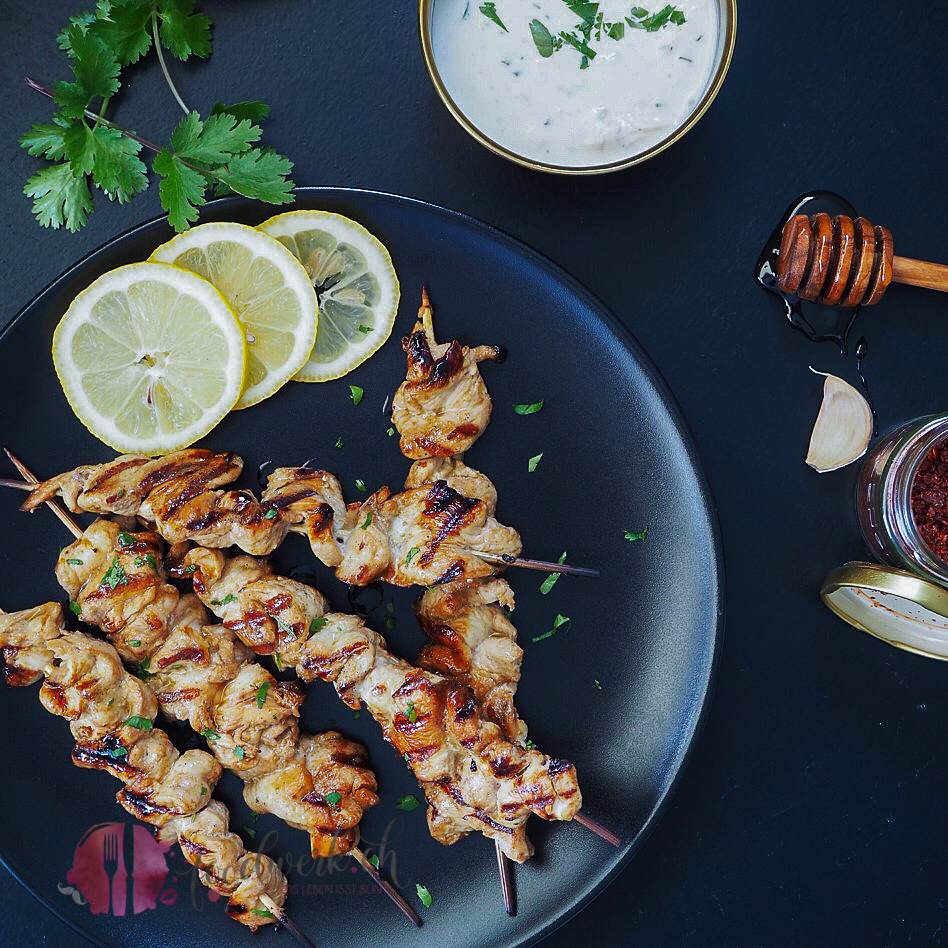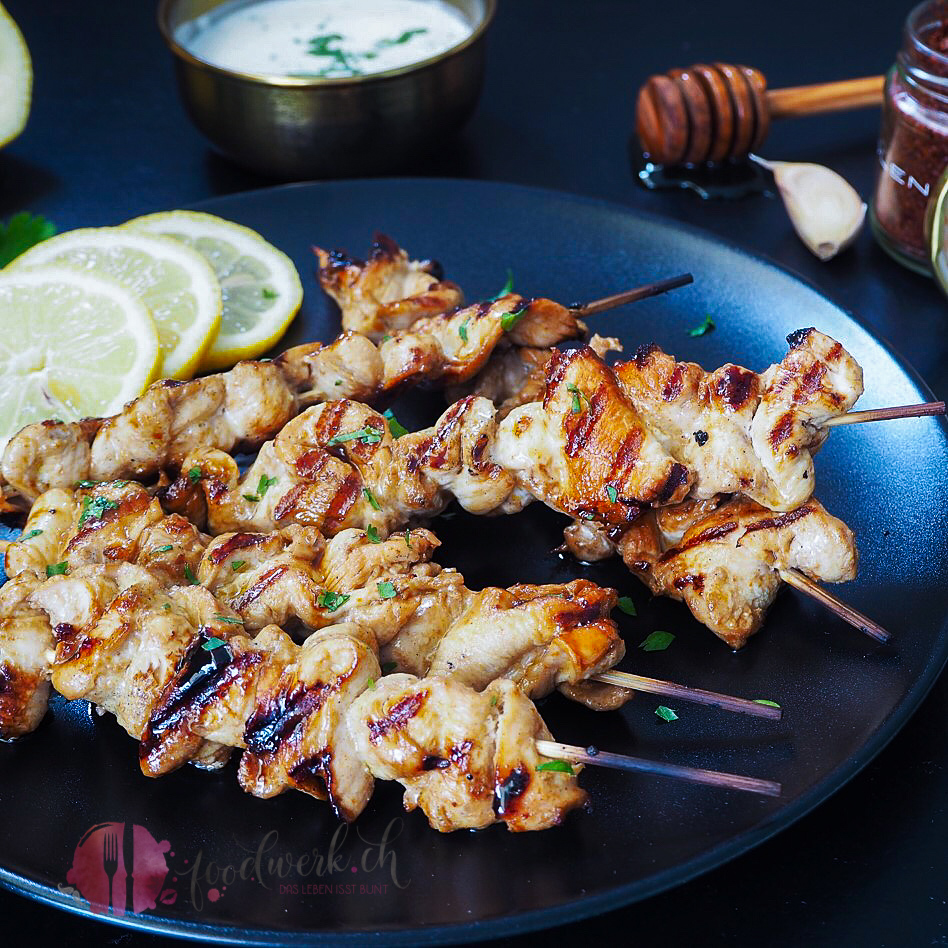 Ihr habt via FB abgestimmt was als nächstes Rezept erscheinen soll. Das Rennen knapp gewonnen vor dem Dessert im Glas hat ein Grillrezept. Und so präsentieren wir euch heute diese Hähnchenspiesse mit Honigglasur vom Grill. Die Marinade der Spiesse kommt mit wenigen Zutaten aus. Durch die Glasur, die während dem Grillieren aufgepinselt wird, erhalten die Spiesse einen tollen Geschmack und bleiben schön saftig. Natürlich könnt ihr die Spiesse noch mit Gemüse eurer Wahl ergänzen, wir geniessen lieber einen knackigen Salat dazu und unser Jasminreis mit Safran und Chashewnüssen.