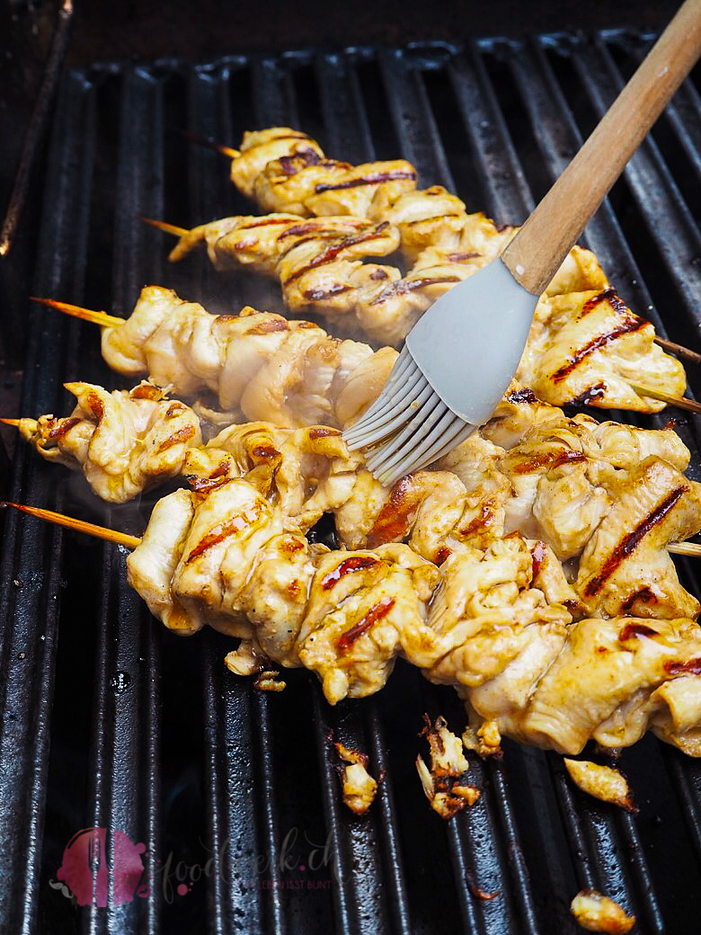 Die Zutaten für die Marinade zusammen verrühren. Die Hähnchenbrust der Länge nach in Streifen schneiden und mit der Marinade vermischen. Das Fleisch mit der Marinade mit Klarsichtfolie abdecken und für mindestens 1 Stunde im Kühlschrank ziehen lassen. Während dieser Stunde haben wir die Holzspiesse im warmen Wasser eingeweicht. So verbrennen euch die Spiesse weniger schnell auf dem Grill. Falls ihr keinen flüssigen Honig Zuhause habt, so könnt ihr den harten Honig durch erwärmen flüssiger machen.