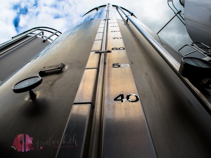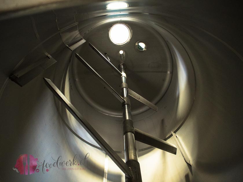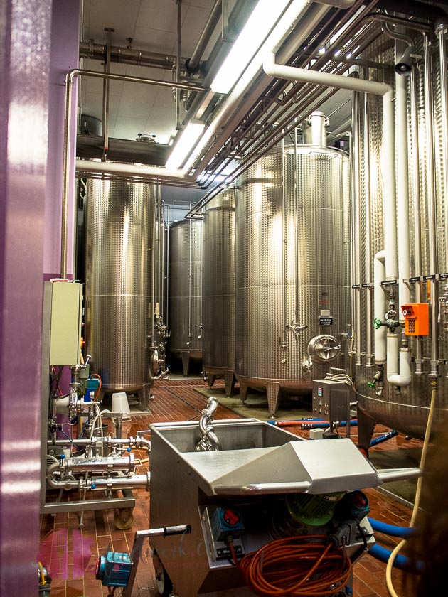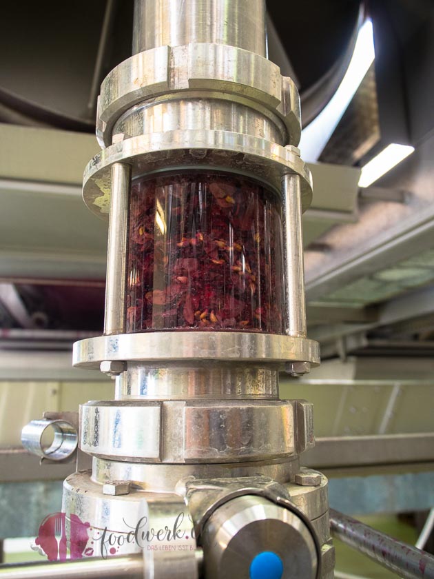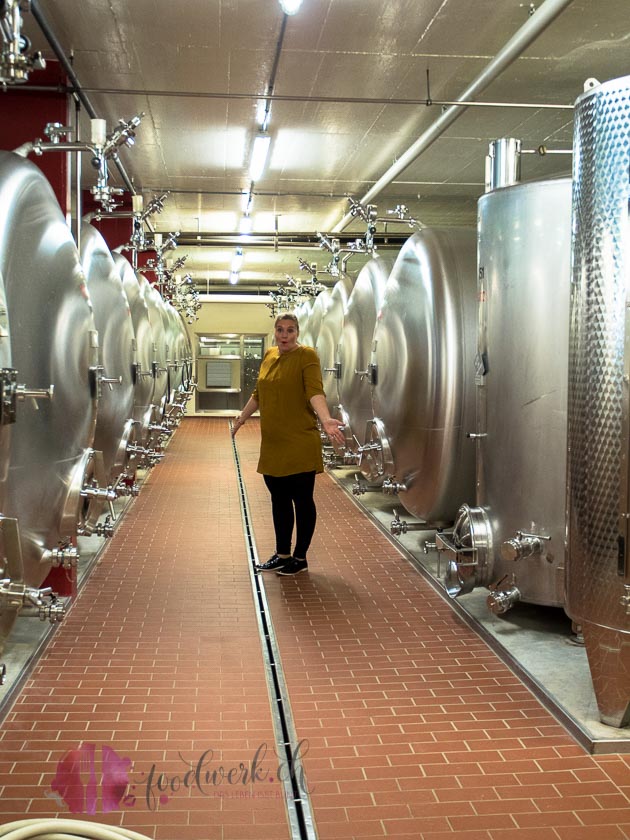 automatischen Palettrolli. Wir haben uns gefragt ob die Höhe der Stapelung auch Erdbebensicher ist, aber ja das ist sie natürlich. Manchmal lustig auf was für Gedanken man kommt beim Anblick dieser Harrassentürme. Vorbei an gigantischen Tanks, die bis zu 30`000 Liter Fassungsvermögen haben in den Gärkeller. Jährlich verlassen nämlich 3 Mio Liter alkoholfreie Getränke sowie 2 Mio alkoholhaltige Getränke das Unternehmen. Vor der Weihnachtszeit (das heisst bereits ab Mitte Oktober) wird daher im Schichtbetrieb gearbeitet. Da die Bauern der umliegenden Bauernhöfen im Winter nicht ganz soviel Arbeit haben wie im Sommer, können sie die zusätzlichen Schichten abdecken. das ist eine win win Situation für beide Seiten. Rimuss gibt den umliegenden Winzern eine Abnahme Garantie, dass sie all ihre Trauben annehmen, egal wie die Ernte aussfällt. So werden pro Stunde rund 25 Tonnen Trauben angeliefert in der Haupterntezeit. Jedoch reicht diese Menge nicht aus um die ganze Menge der alkoholfreien Getränke zu produzieren und so wird im nahen Italien für süssen Traubennachschub gesorgt.