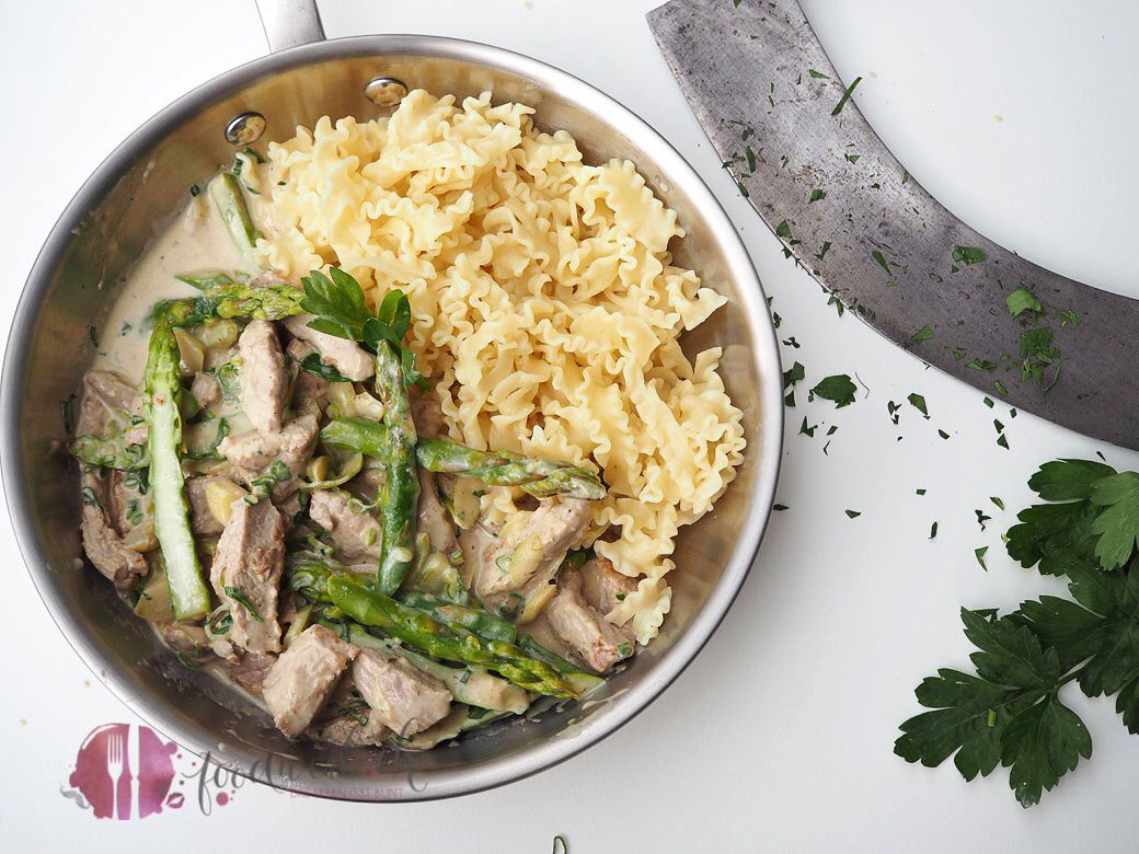 Die Zutaten für dieses Frühlingsgericht könnt ihr alle wunderbar im vornherein bereitstellen und müsst dann nur noch kurz alles in einer Pfanne fertigstellen. Eigentlich ein ideales Gericht, wenn man Gäste hat. Der Geschmack wird durch die kurze Kochzeit sehr intensiv, und durch die Frische der Produkte und der kurzen Kochzeit bleiben die Vitamine da wo sie sollen, nämlich im Gemüse drinnen. Dies natürlich auch, weil die Spargeln nicht vorgekocht werden und somit mit dem Spargelsud wichtige Vitamine weggeleert werden. Demnächst werden wir euch zeigen, wie ihr frische Spargeln auch noch zubereiten könnt wenn ihr die Spargeln nicht in der Sauce kocht.