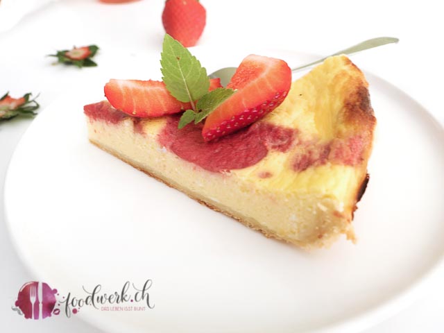 Die Vanille- Quarkmasse nun auf den vorbereiteten Blätterteig giessen und mit einem Löffel Erdbeersaucen Keckse auf die Masse geben. Mit Hilfe einer Gabel die Punkte etwas verziehen. Nun bereits id den vorgeheizten Ofen geben und zuerst 20 Minuten bei Unterhitze backen und danach noch weitere 25 Minuten bei 180Grad Ober/ Unterhitze.