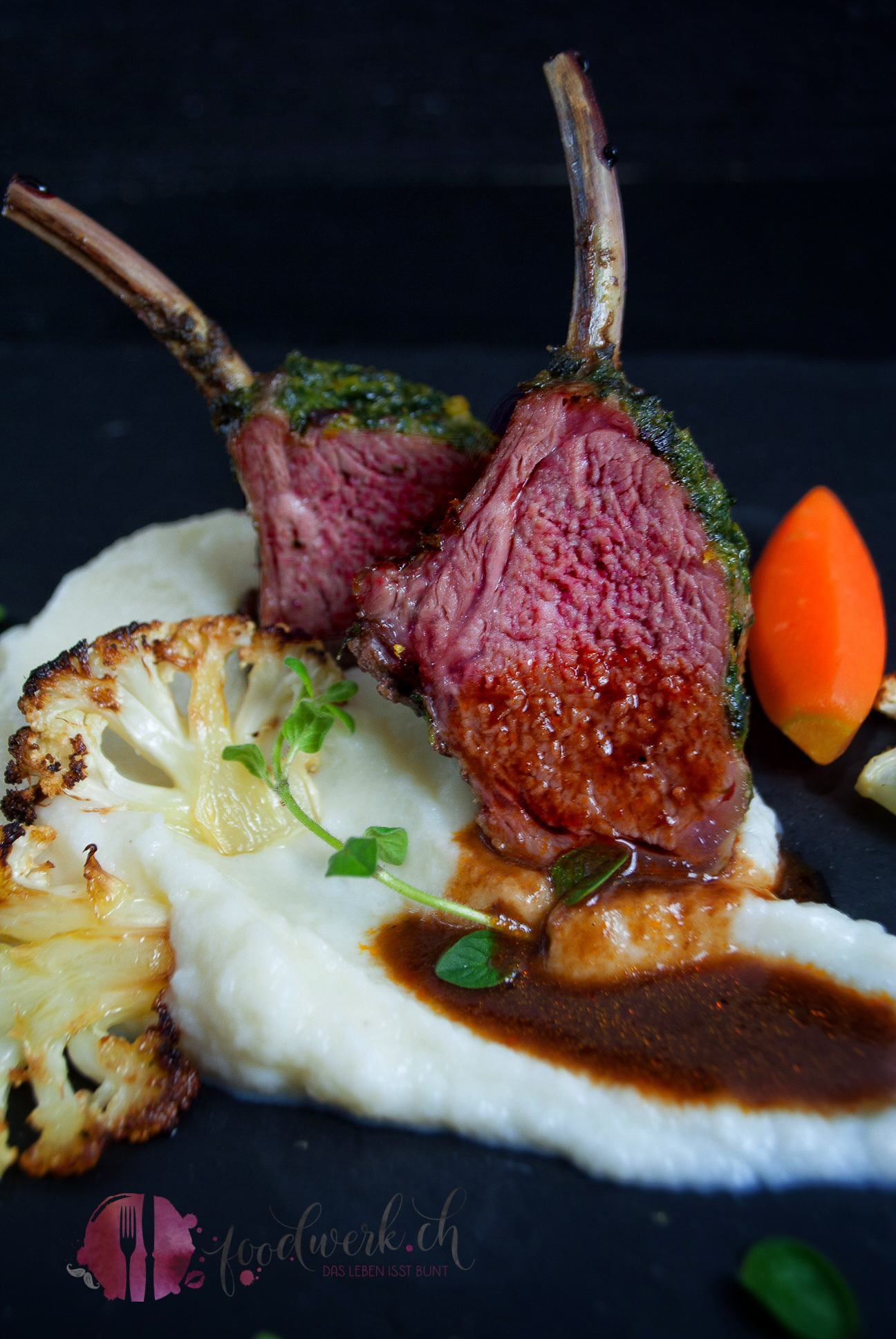 Nun das Lammfleisch aus der Marinade nehmen und der Rest der Marinade etwas vom Fleisch streifen. Das Fleisch von beiden Seiten leicht salzen und 4 Minuten scharf anbraten. In eine Gratinschale legen und nochmals mit der Marinade bepinseln und im Ofen bei 80 Grad ca. 80 Minuten ( Kerntemperatur 55 Grad) weitergaren. Danach mit Alufolie abdecken und für ca. 3 Minuten stehen lassen. So kann sich der Fleischsaft im Innern gleichmässig verteilen und das Fleisch bleibt schön saftig. Wir haben dazu ein Blumenkohlpüree serviert.