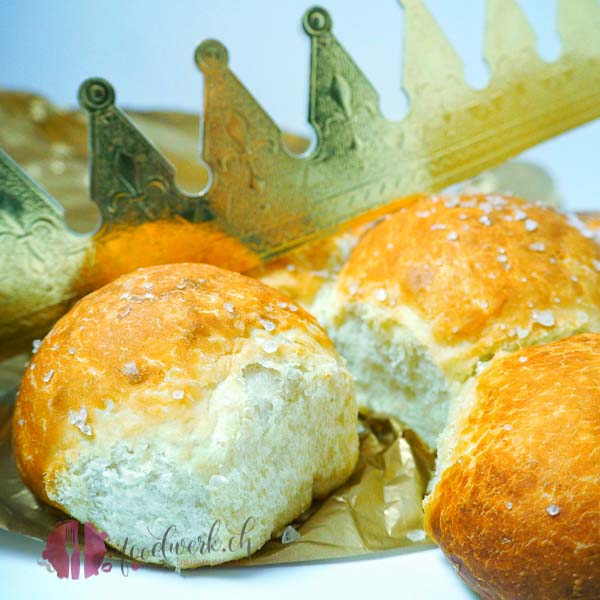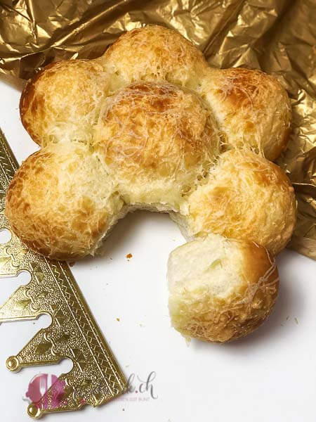 Das grosse Teigstück in die Mitte (ohne König) und die anderen 6 Stück darum herum verteilen. Den einen haben wir mit grobem Meersalz bestreut, den anderen mit etwas frisch geriebenem Käse. in unserem Falle war es Greyerzer. Einfach einen Käse wählen der gut schmilzt. Eine halbe Stunde nochmals gehen lassen bevor sie dann für 25 Minute in den auf 170 Grad Umluft vorgeheizten Backofen wandern. (Falls ihr euren Dreikönigskuchen glänzender mögt, so bestreicht ihn vor dem Backen, jedoch nach dem Laugenbad mit einem verquirltem Ei).