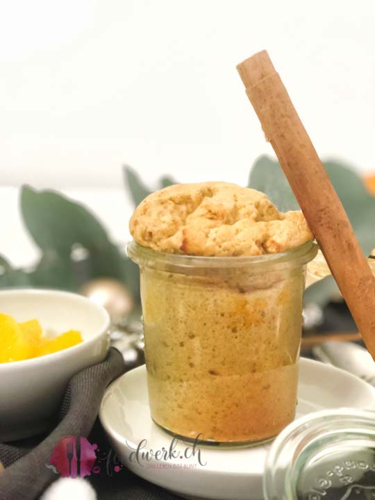Der Ricotta (alternativ könnt ihr auch Quark verwenden) zusammen mit dem Ei, dem Lebkuchengewürz, Orangenabrieb (achtet darauf dass ihr nur die orangene Schicht rein reibt und nicht das weisse, ansonsten wird es bitter) und SteviaSweet vermischen. Danach die Speisestärke untermischen. Das Eiweiss in einer fettfreien Schüssel zusammen mit dem Salz steif schlagen. Das Eiweiss unter die restliche Masse ziehen und in 4 gefettete, feuerfeste Förmchen füllen (wir haben hierfür kleine Weckgläser verwendet). Bei 160°C Umluft ca. 15-20 Minuten backen. Das variiert stark, je nach Ofen. Sind sie schön goldig, dann sind sie perfekt.