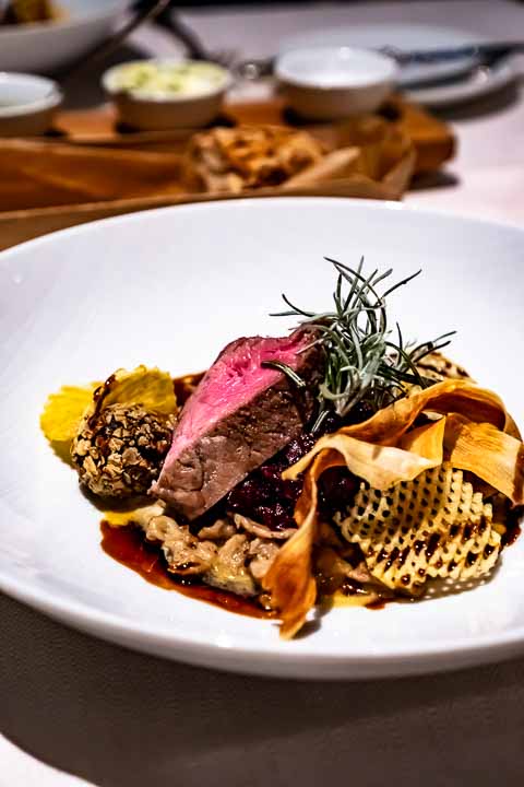 Der Hauptgang bestand aus einer Hommage an das Bödeli Jungrind. Das Hotel hat vom Bauernhof Rychengarten ein ganzes Jungrind abgekauft und verwendet davon alles was es hergibt. Nose-to-tail wird bei Stefan Beer zelebriert und davon waren wir sehr begeistert. Ach übrigens, über den Hauptgang wurde ein Mattener Whisky-Kräuterlikör gespritzt. Sehr kreativ. Ein herrliches Gericht und die Philosophie dahinter: genial.
