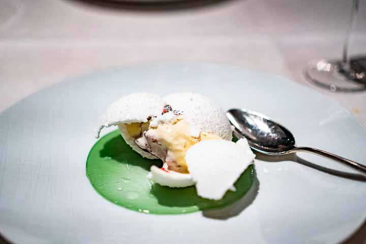Zum krönenden Abschluss wurde uns eine weisse Kugel auf einem grünen Kreis aus Apfel-Gele serviert. Dieses Dessert hat sogar Rahel umgehauen und das will etwas heissen (Rahel mag normalerweise kein Süsses!). Uns wurde ein Löffel in die Hand gedrückt und mit einer Handgelenks-Geste gezeigt, dass wir draufhauen sollen. Das muss uns niemand zweimal sagen – BAM, BAM – und die Kugel offenbarte ihr köstliches Innere. Das faszinierende dieses Desserts ist, dass alle Zutaten ausnahmslos aus einem Hof kommen: Wyssacherhubel. Die Meringue-Kugel aus den Eiern des Hofs, der Eierlikör ebenfalls mit dem eignen Eigelb sowie Zwetschgenschnaps und natürlich auch die Zwetschgen sowie Äpfel der Familie Wyss.