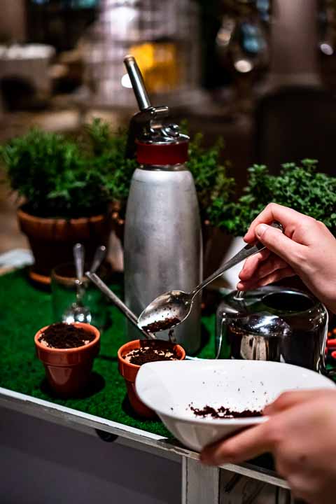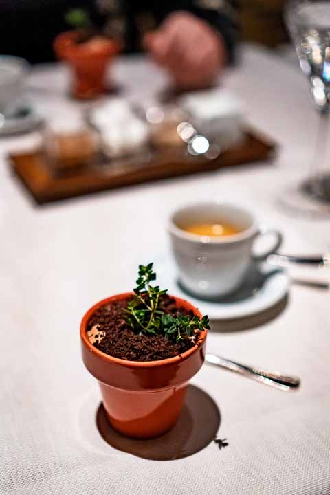 Mit dem Espresso dachten wir dieser Zauber wäre bereits fertig, doch zu unserem Glück kamen da noch die «Friandises». Ein Wort welches wir noch nie gehört haben – kein Wunder, denn es war Französisch. Es bedeutet so viel wie «eine kleine Nascherei». Wir möchten hier anmerken, dass wir zu diesem Zeitpunkt rappelvoll und glücklich waren. Das heisst, wir erwarteten nicht noch ein ganzes Dessert, geschweige denn ein kleiner Blumentopf mit Schokoladenmousse, Schokoerde und einem Blümchen, welches direkt am Platz zubereitet wurde.