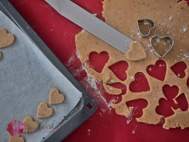 - Auf leicht bemehlter Arbeitsfläche den Teig ca. 4mm dünn auswallen. Mit beliebiger Keksform den Teig ausstechen. Wir haben klassisch das Herz gewählt.