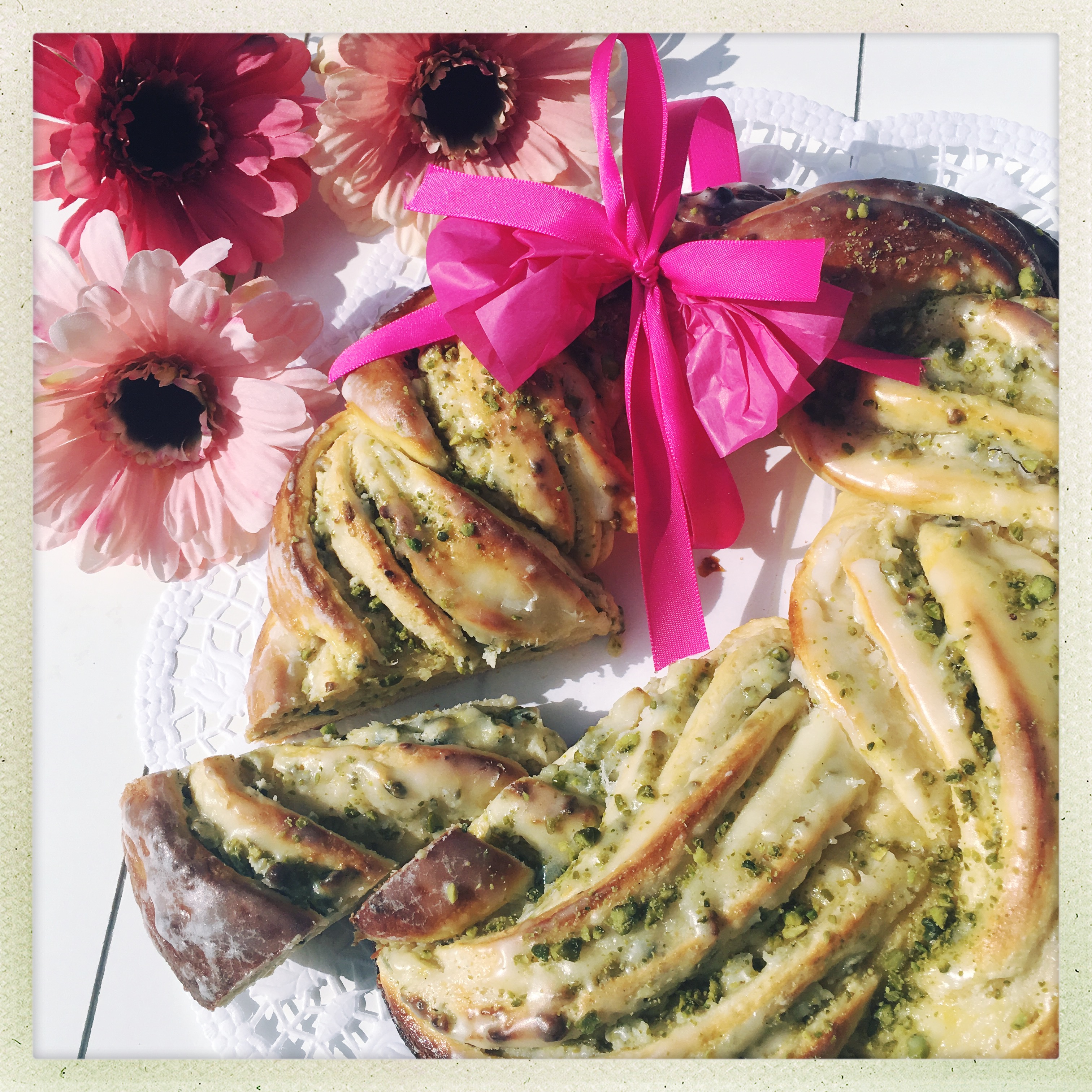 - Den Kranz noch warm mit der Puderzucker Zitronenglasur bestreichen. Hierfür einfach den Zitronensaft mit dem Puderzucker vermischen, den Kranz damit einstreichen, die gehackten Pistazien darüber streuen und fest werden lassen.