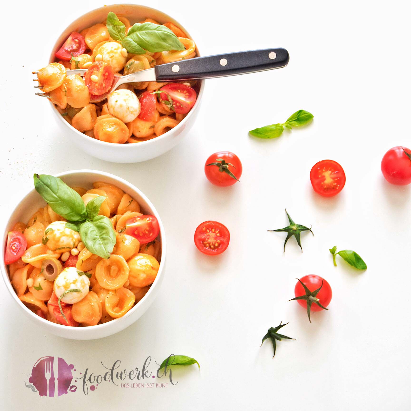Das Tomatenmark, Olivenöl, den Weissweinessig, Parmesan, Zitronensaft, den Oregano und 1/3 der Pinienkerne mit dem Pürierstab zu einer Sauce mixen. Mit Kräutermeersalz und Pfeffer abschmecken. Die Orecchiette in reichlich Salzwasser kochen. Die Cherry Tomaten vierteln, die Oliven halbieren und in einer Schüssel mit der Sauce vermischen. Die Mozzarella Kugeln und den geschnittenen Basilikum hinzugeben. Sobald die Orecchiette al dente sind, diese abgiessen und vorher noch 2 EL Pastawasser der Sauce hinzugeben. Die Pasta leicht unter fliessendem Wasser abschrecken bis diese nur noch lauwarm sind und unter die Sauce mischen. Nochmals mit Kräutermeersalz und Pfeffer abschmecken. Falls ihr es etwas pfiffiger mögt könnt ihr noch etwas Chiliflocken hinzufügen.