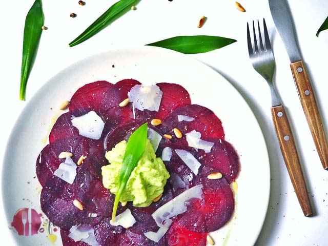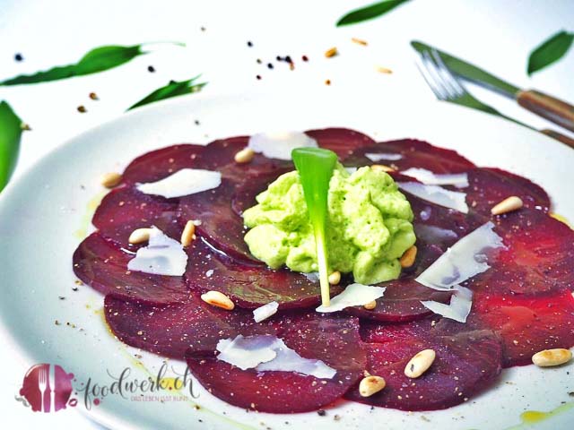 Dieses Randen Carpaccio mit Bärlauch Espuma, ist ein perfektes Essen oder Vorspeise für Gäste. Das Espuma (so nennt man diesen Schaum) kann man nämlich getrost schon einen Tag im voraus zubereiten. Die Randenscheiben können ebenfalls schon geschnitten und gut zugedeckt im Kühlschrank gelagert werden. Ob ihr nun lieber euer Lieblingsdressing oder einfach Essig und Olivenöl, Salz und Pfeffer über das Carpaccio verteilt bleibt ganz eurem Geschmack überlassen.