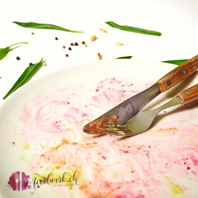 Die in dünne Scheiben geschnittene Randen (wir haben dafür unseren Gemüsehobel verwendet) Kreisförmig auf den Teller legen, etwas Olivenöl und Essig darüber verteilen, mit Salz und Pfeffer würzen. Die Pinienkerne anrösten und ebenfalls darüber verteilen. Mit den Parmesanspänen dekorieren, diese haben wir mit dem Sparschäler gemacht. In die Mitte nun einen Tupfen Bärlauchschaum sprühen und sofort servieren. Der Bärlauchschaum fängt nach ein paar Minuten an in sich zusammen zu fallen. Also erst vor dem Servieren darauf geben, dies ist jedoch eine Sache von ein par Sekunden und kostet kaum Zeit.