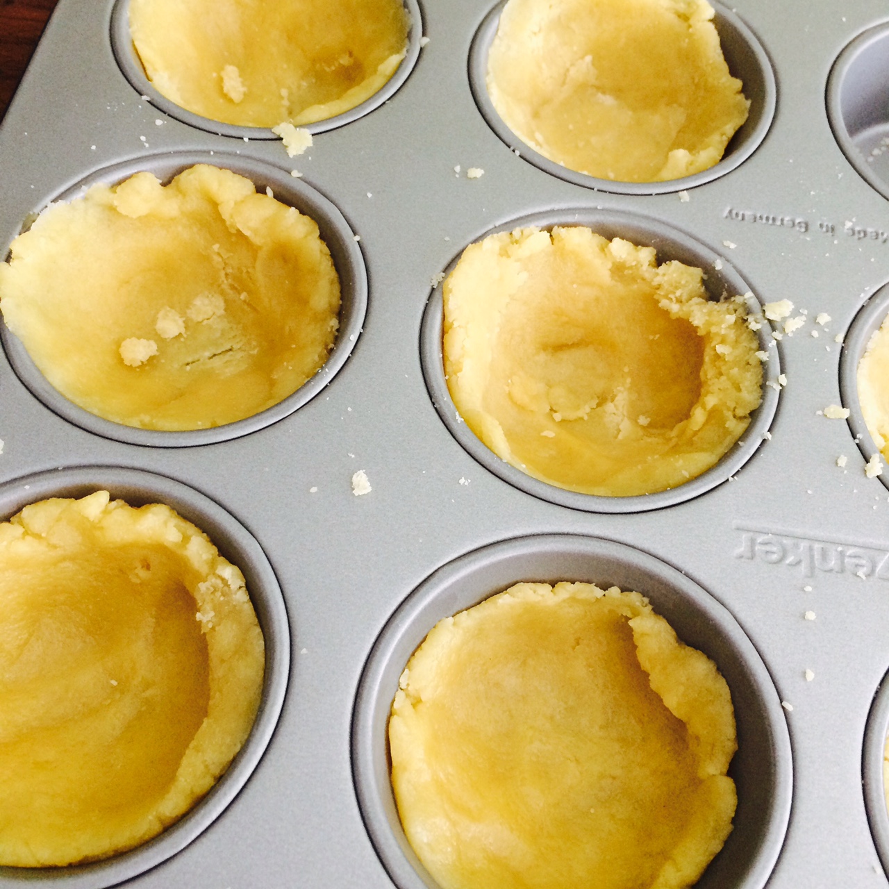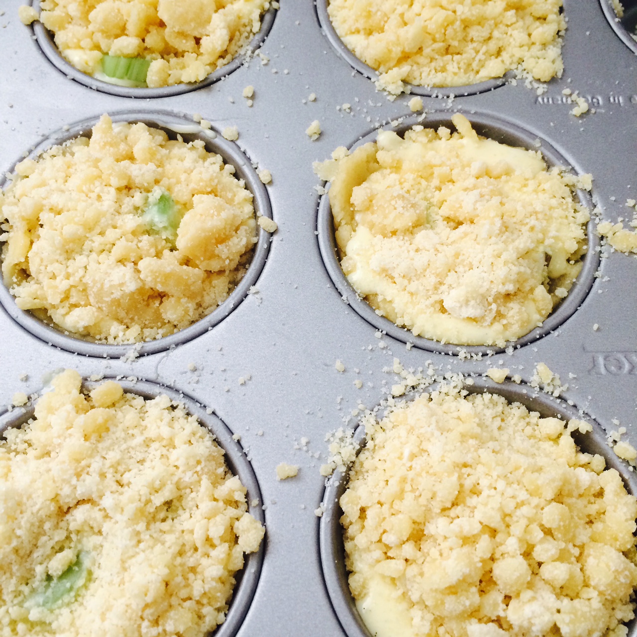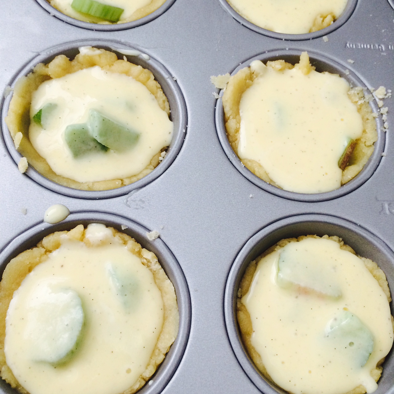 Für den Teig die Butter in einer Pfanne schmelzen und etwas auskühlen lassen. Alle restlichen Zutaten in eine Schüssel geben, die Butter dazu und alles mit dem Knethaken krümelig rühren. Ca. 1/3 des Teiges zurück behalten, den Rest in eingefettete Muffinformen drücken und am Rand etwas hochziehen. Die Zutaten für den Guss miteinander verrühren und gleichmässig über die mit Rhabarberstücken ausgelegten Teigböden verteilen. Die restliche Teigmasse zerkrümeln und als Streusel über die Tartelettes gleichmässig verteilen. Bei ca. 180°C während rund 20 Minuten backen. Die Tartelettes lassen sich nach dem auskühlen besser aus der Muffinform lösen.