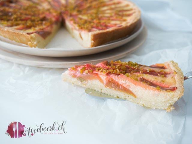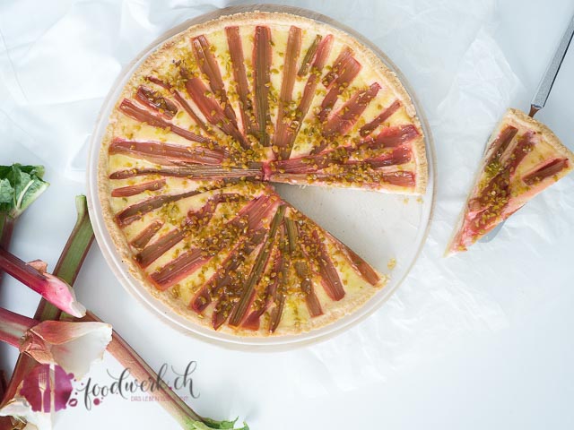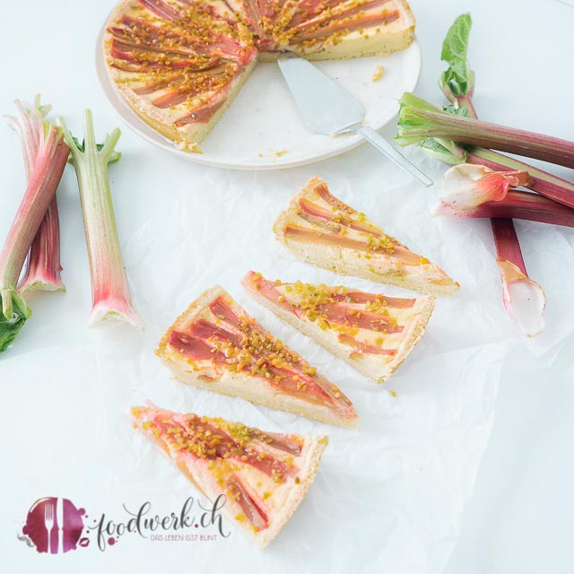 Die Rhabarber grob schälen und in „Streifen“ schneiden. Wir haben sie geviertelt. Natürlich könnt ihr sie auch wie gewohnt in Stücke schneiden, uns hat dieses Muster so aber gefallen. Die Griessmasse auf den Mürbeteig giessen und mit dem (oder sagt man der? Der oder die Rhabarber? Ha, habe gegoogelt, der Rhabarber);-) belegen mit den gehackten Pistazien bestreuen und bei 160 Grad Umluft ca. 50 Minuten backen. Auskühlen lassen und geniessen.
