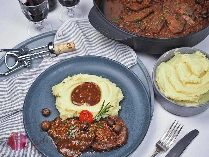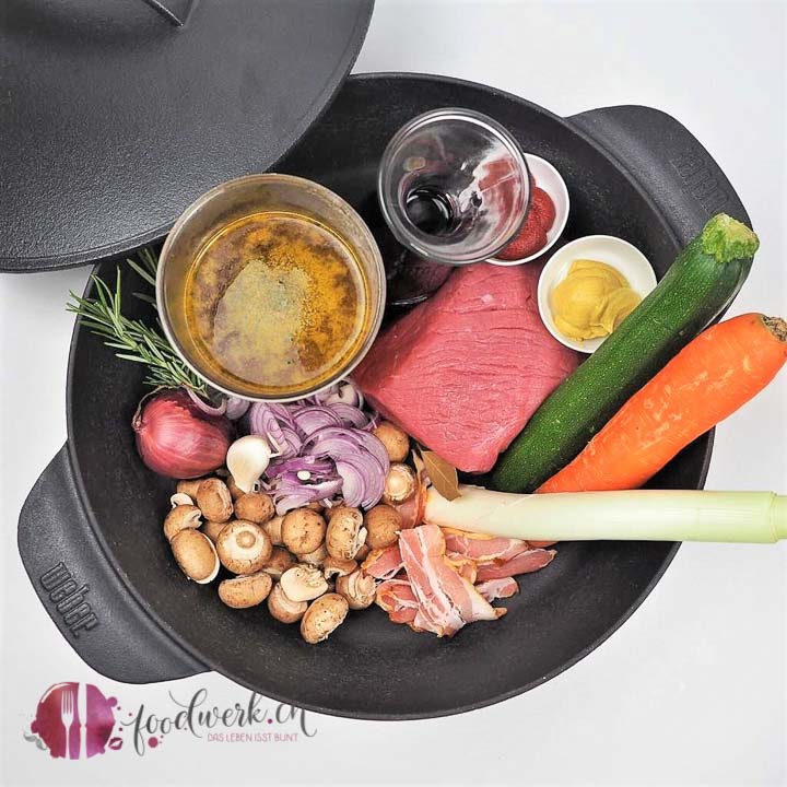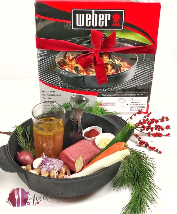Im Dutch Oven, welchen wir ebenfalls von Weber Grill haben, kann man nämlich nebst Brot backen, Fondue oder auch den leckeren Pastaauflauf den wir euch bereits gezeigt haben, auch Fleisch schmoren. In den kalten Monaten mögen wir das besonders gern, da dann auch eine leckere Sauce zum Fleisch entsteht und dies mit sehr kleinem Aufwand. Dazu Stocki (Kartoffelpüree) wie wir Schweizer sagen. Stock mit Seeli (Kartoffelstock mit Saucensee ) und einem zart geschmorten Fleisch ist definitiv auch würdig, um Gäste zu empfangen. Ein super einfaches Rezept bei welchem, wie oben schon erwähnt, ihr nicht immer daneben stehen müsst.