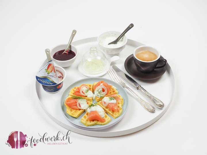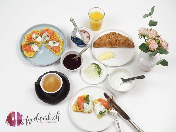 Waffeln müssen ja definitiv nicht immer süss sein oder? Der Lachs auf den Waffeln harmoniert perfekt und gibt dem Brunch gleich eine andere Note. Wir haben dazu einen leichten Dilljoghurt serviert, was die ideale Ergänzung dazu ist.