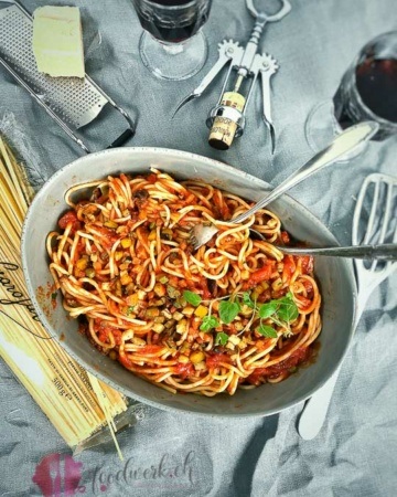 Spaghetti alla tavernara mit Röstgemüse