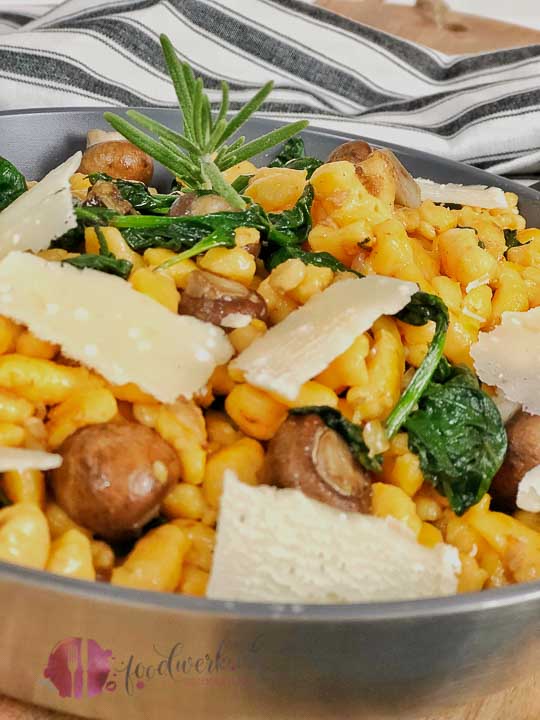 Die abgetropften Spätzli beigeben und mischen. Gut abschmecken und mit Käse bestreuen. Falls ihr die Spätzli lieber kross mögt, so könnt ihr diese in einer separaten Pfanne anbraten bevor ihr sie zum Spinat gebt. Und falls ihr es noch etwas cremig mögt, so könnt ihr noch 50 ml Sahne hinzufügen. Ihr seht, es kann ganz euren Bedürfnissen angepasst werden. Auch die Süsskartoffelspätzli nature an solches sind köstlich, denn das Leben isst bunt!