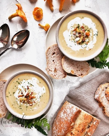 Herbstsuppe mit Pfifferlingen und gebrannten Knoblauchmandeln